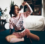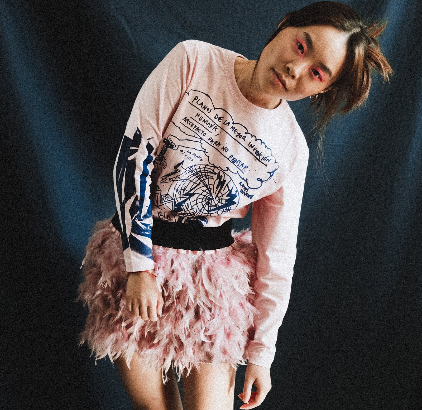 Camiseta manga larga rosa claro con serigrafía azul. Todas las mangas son diferentes.