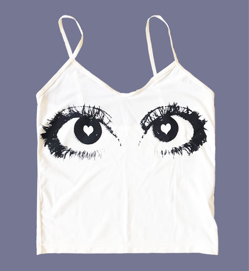 Top blanco elástico de tirantes. Medidas aproximadas de la tela: 34x32 cm. Serigrafía negra.