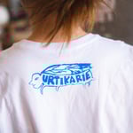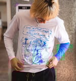 Camiseta blanca de manga larga con serigrafía azul en la parte delantera y en un brazo, piezas únicas, cada manga está impresa de forma diferente.