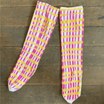 Calcetines blancos de 60 DEN, adaptables y elásticos con serigrafía rosa y amarilla. FIT ALL SIZES. Se adapta a tallas 36-43.